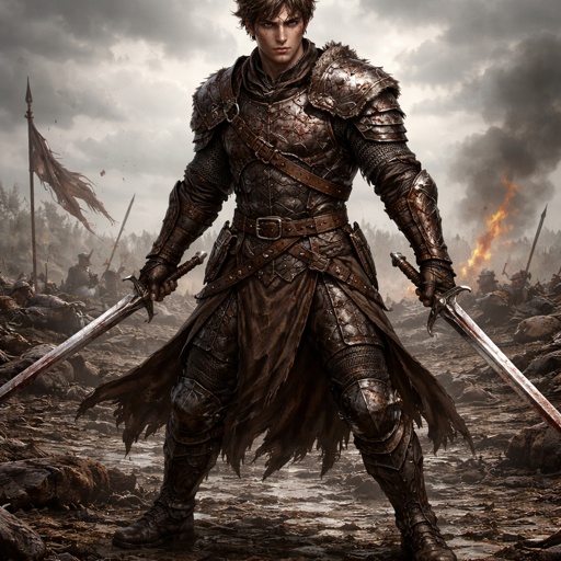 22, male, 6ft 3, Warrior wielding two long swords, with a mix of leather and chain armour, on a battlefield