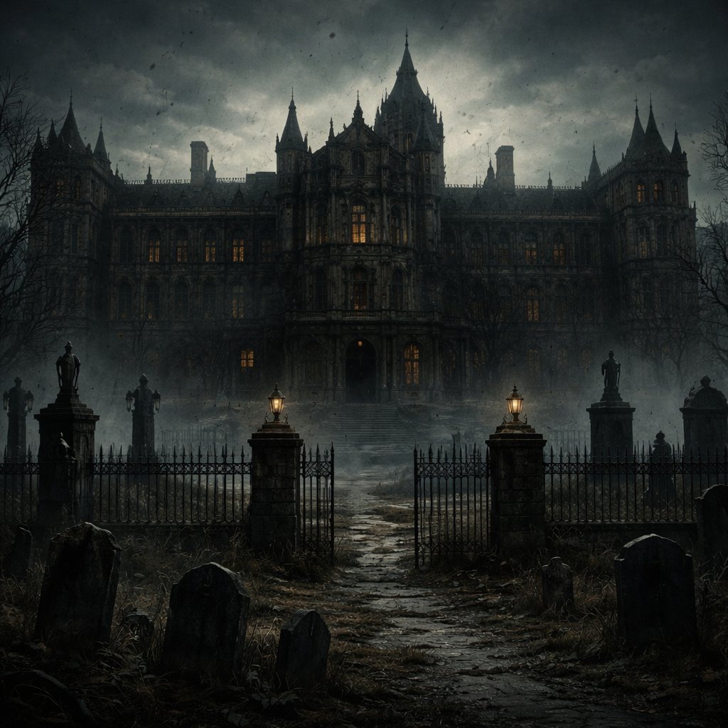 Victorian abandoned asylum with a cemetery in the front