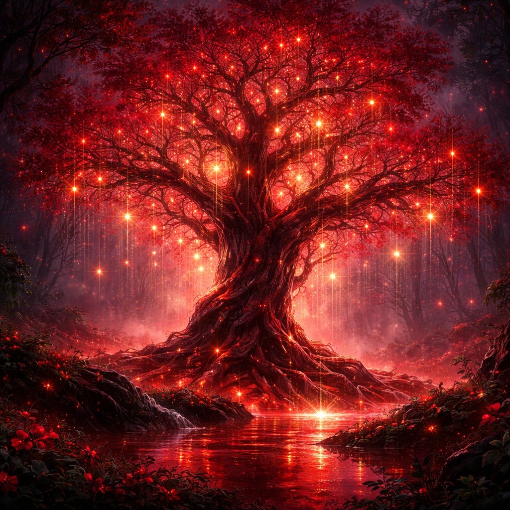 Blood red life tree with stars in it