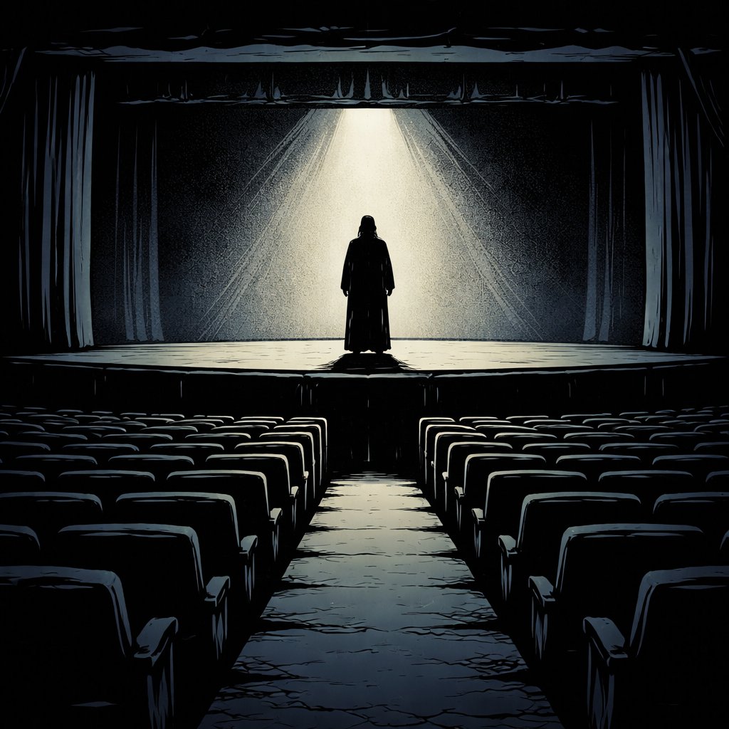 A large empty auditorium in darkness. We see the satge far away. In the middle of the stage is a silhouette of a man in a robe