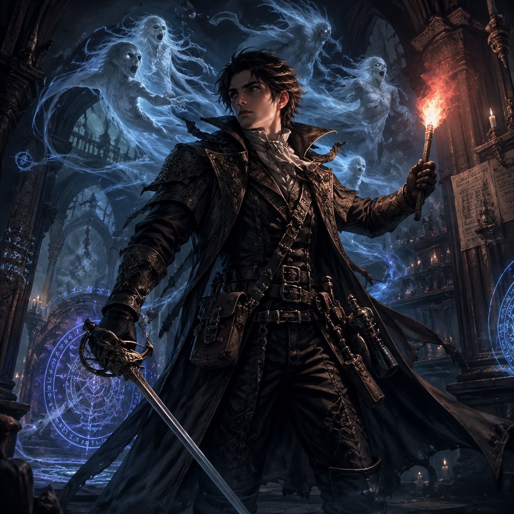 Fantasy ghost hunter character with a dark academia vibe. Character is wearing padded armor, pouches and gear adorns their belt. They wield a rapier in one hand, and a flare in the other. Ghosts can be seen in the background.