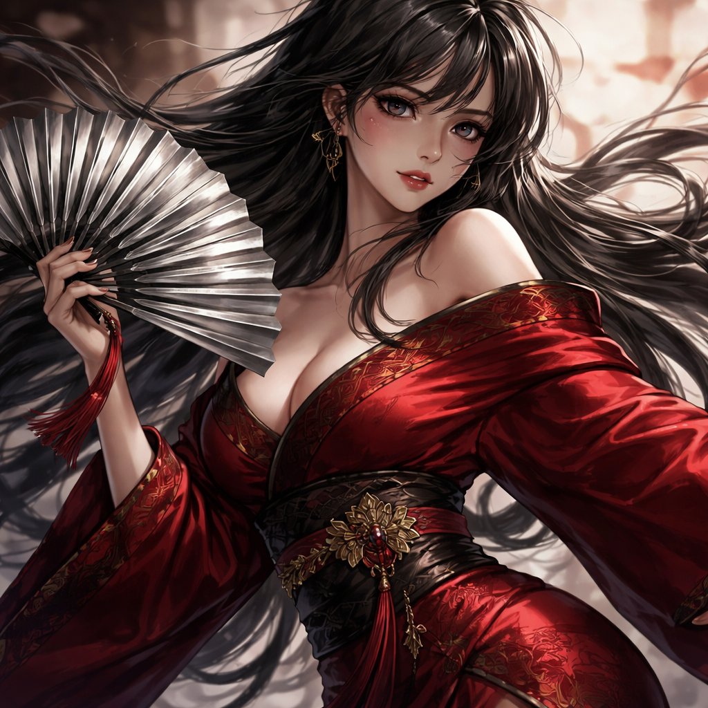 Semi realistic anime girl with dark hair sultry makeup wearing an off the shoulder kimono and using a fan as a weapon