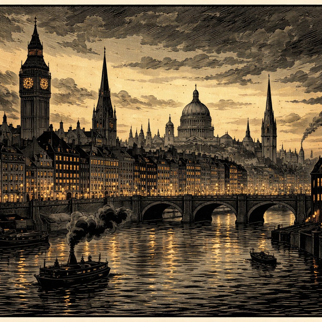 19th century style city skyline. Front view. Early evening