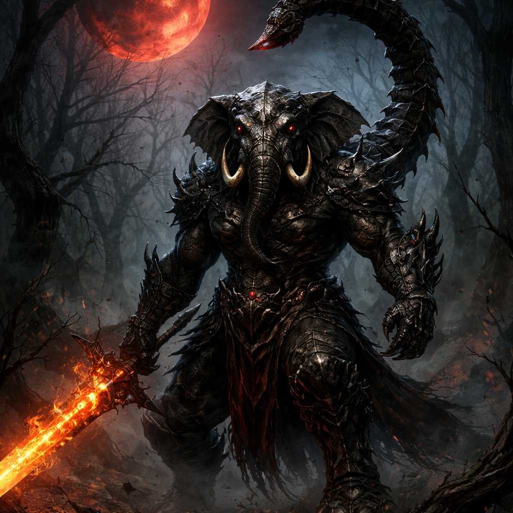Make a man who is human but also scorpion and elephant make him sexy make him holding a great sword with flames he is st...