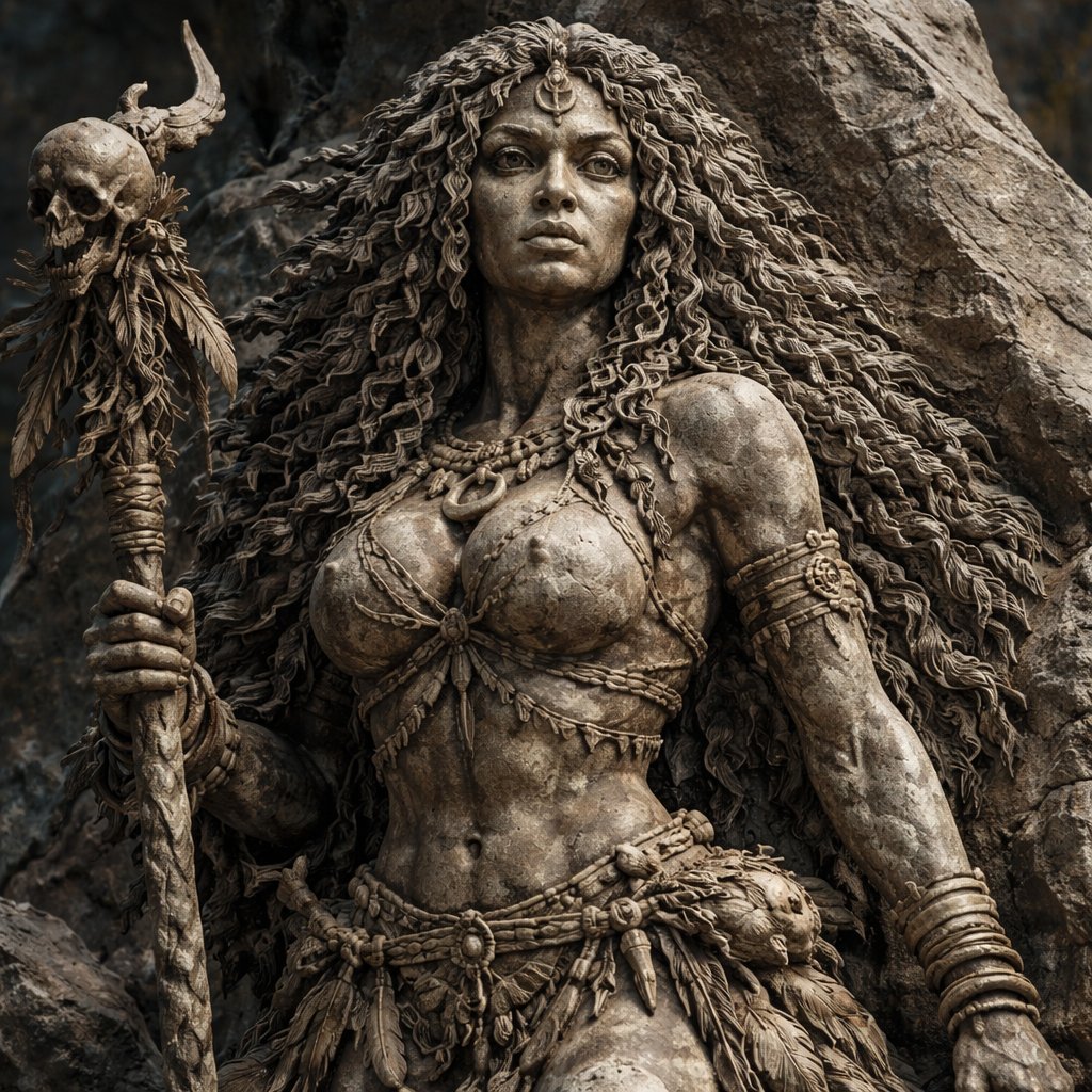 Mixed race black and white woman with curly long hair down to her hip. mountain tribe witch. Fit athletic. Tan skin.
