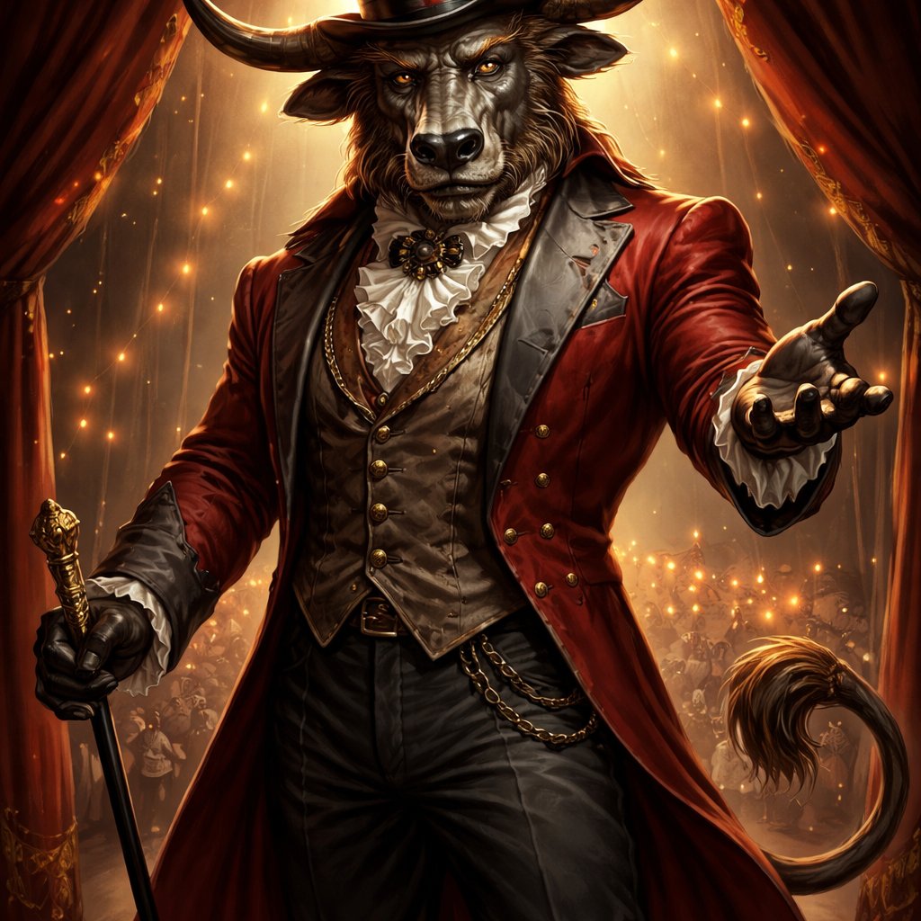 A captivating silvergrey-brown male Minotaur that’s 6 1/2 feet tall with well~proportioned figure/body with deep set cattle like brown eyes, large powerful gleaming horns like his fathers, a long tail. He works at freak show as the ringmaster and his abilities are Reality Rejection, Time Manipulation (Chronokineses), Zoolingualism (Language of Cattle only), Human Speech. His outfit consists of a crimson tailcoat, frilly shirt, stunning grey blazer, black pants and top hat. His face surely looks like a cross between a human and a Cretan Cattle. His mother is a human with half-animal (Cretan Cattle) physiology and his father is a Cretan Bull.