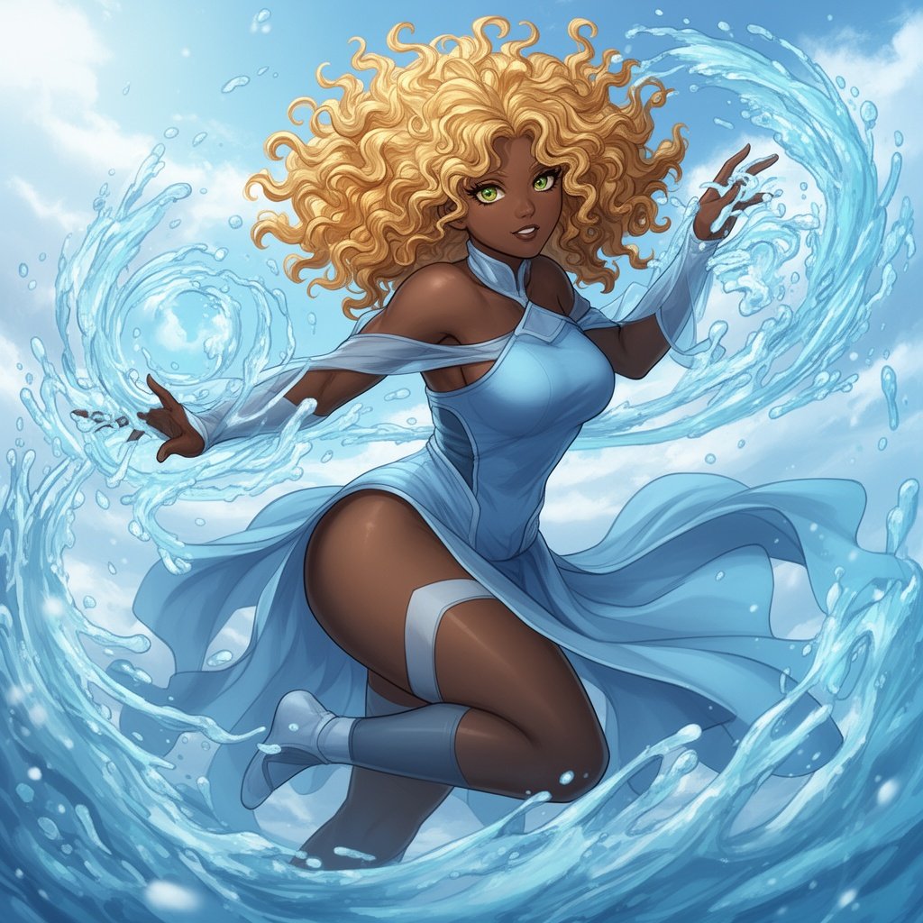 Black female with curly honey blonde , hazel green eyes and a curvy figure who's a water bender