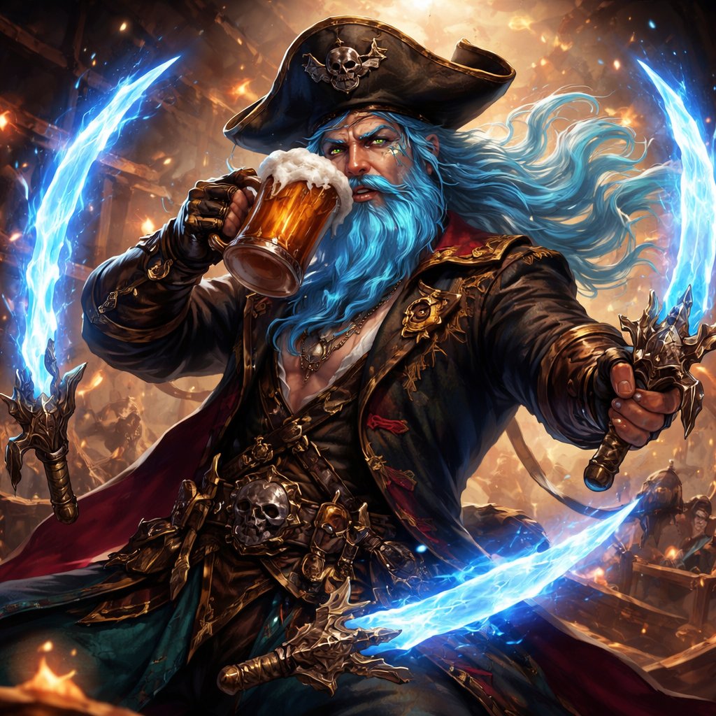A pirate with light blue hair and beard wielding 3 scimitars while drinking ale