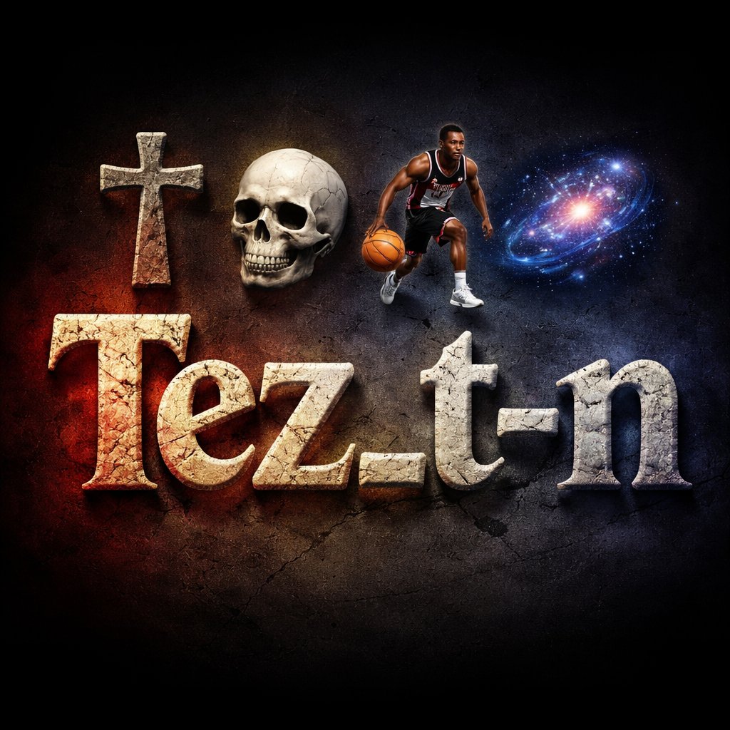 Words spelled just like this: Tez_t-n with these emojis above the word ✝️💀⛹🏾♂️🌌above the name Tez_t-n with glowing l...