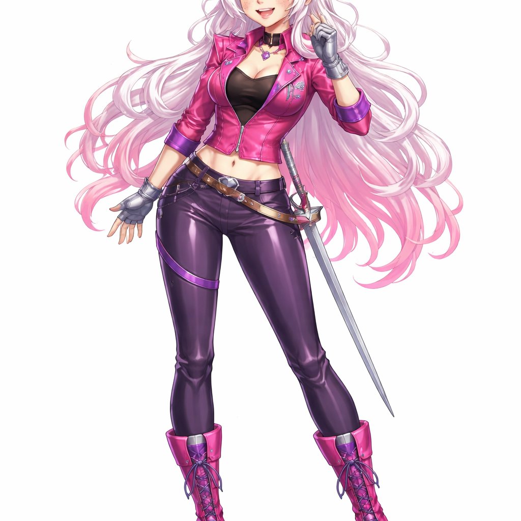 Full body shot. A cute young woman with long white hair that’s bright pink at the tips. Her hair is wavy and voluminous. Aha has bright green eyes, freckles, and a cheerful smile. She is wearing a form fitting pink leather jacket with purple accents, a small silver belt with a thin sword hanging off it, silver fingerless gloves, purple leather pants, and pink boots with purple laces. It looks like a superhero outfit.