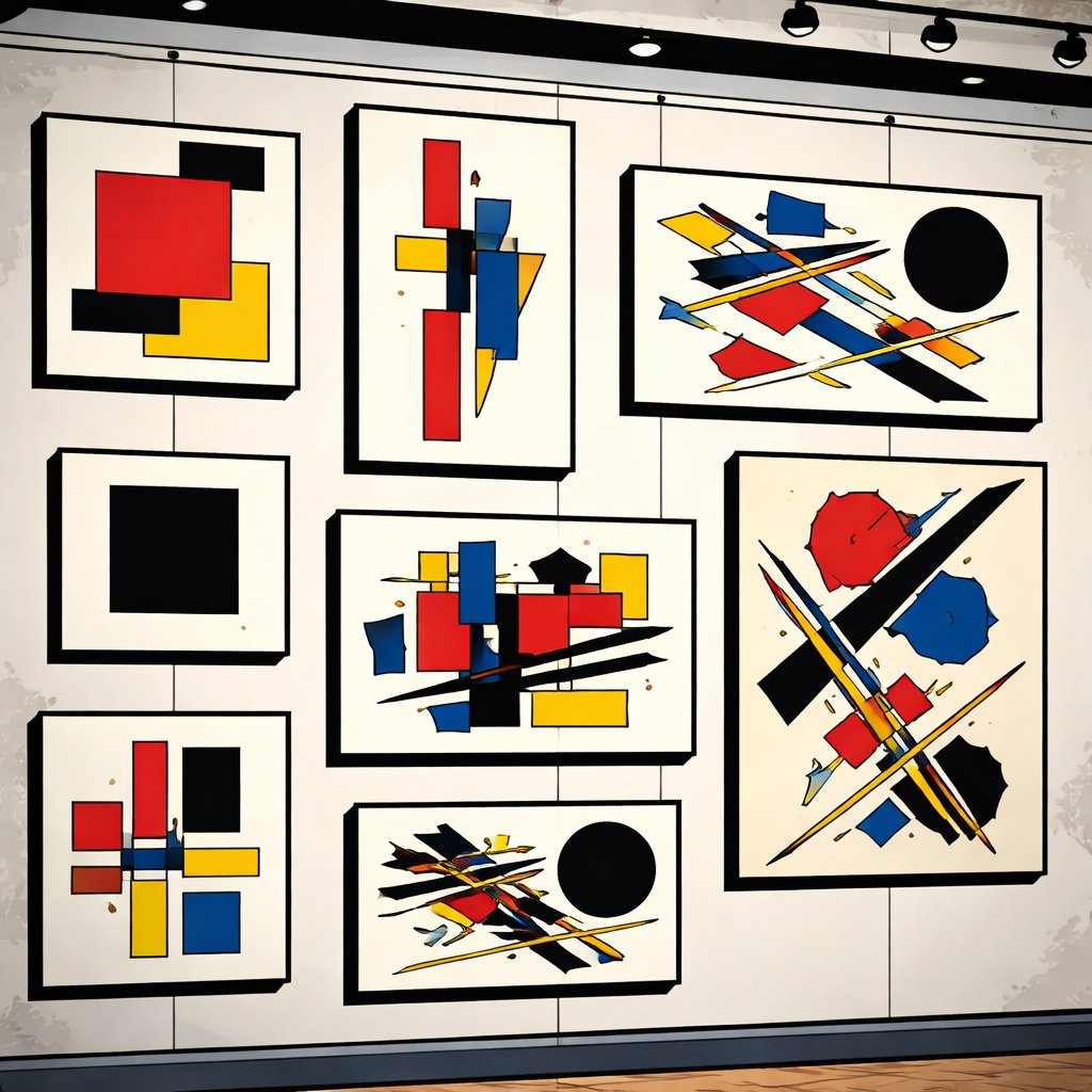 No caricature, no speech bubbles, realistic, a wall with several modern paintings in the style of kazimir malevich in an...