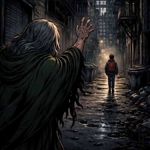 Refined realistic no caricature. No speech bubbles. A small figure in a cloak is running out of frame toward us. He is a...