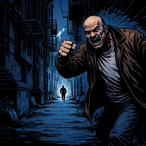 Refined realistic no caricature. No speech bubbles. In the far ground, an ugly man is waving his fist at a small figure ...