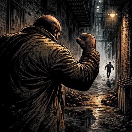 Refined realistic no caricature. No speech bubbles. In the far ground, an ugly man is waving his hand in farewell in the background is a tiny figure. It is late evening in the dark city favela.