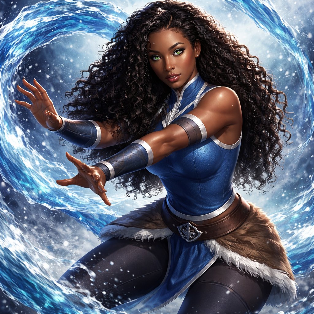 Black female with curly , hazel green eyes and a curvy figure who's a water bender