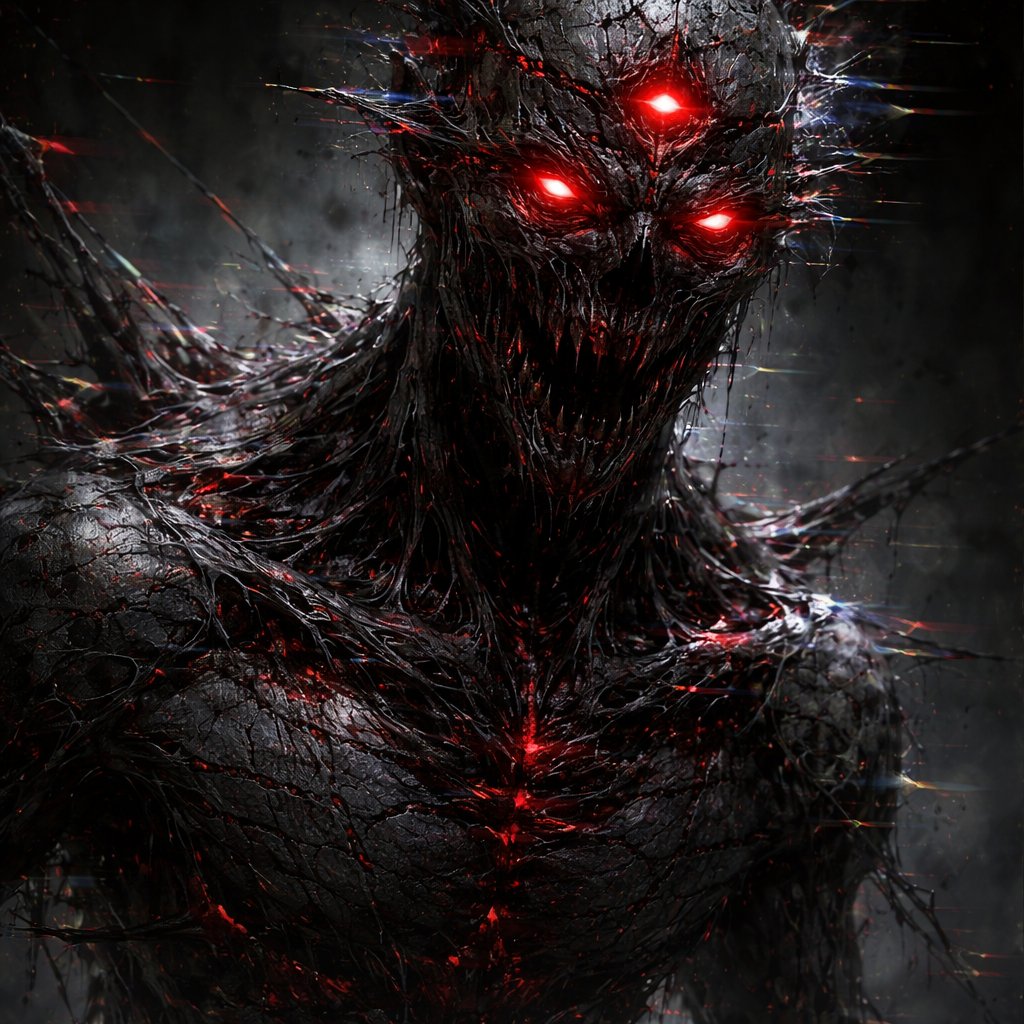 A complete corrupted body and distorted with error and has three sharp eyes