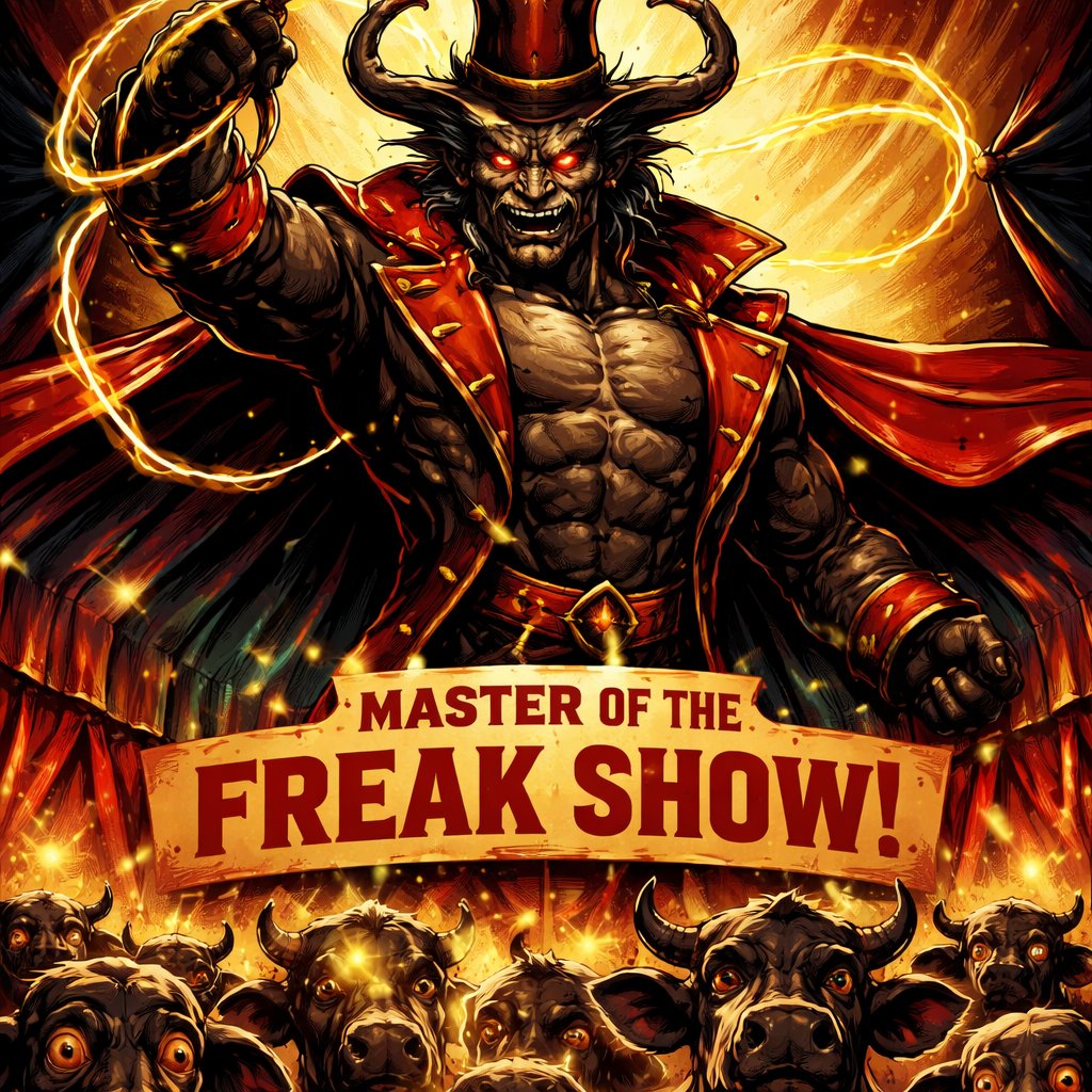 A Minotaur with a well~proportioned figure that works at freak show as ringmaster. That has gifts/abilities like Reality Rejection, Time Manipulation (Chronokineses), Zoolingualism (Language of Cattle only), Human Speech.