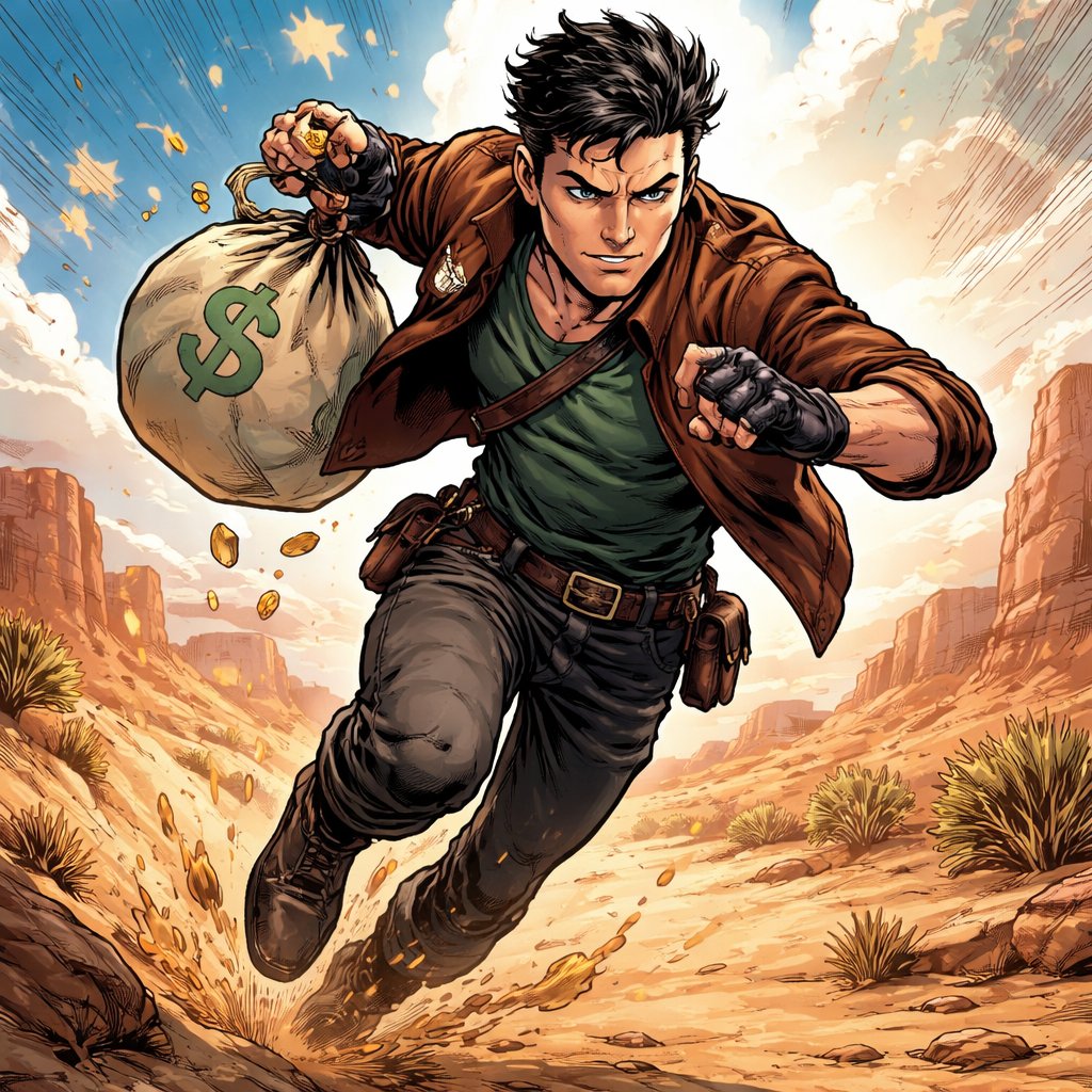 Thief runing trough desert short cut hair