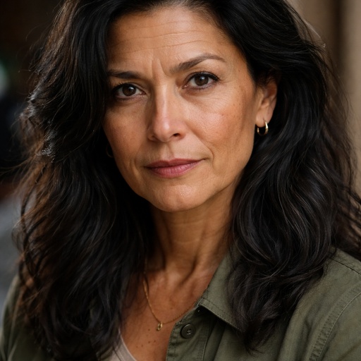 A 50 year old woman who has black hair and dark brown eyes. She looks determined.