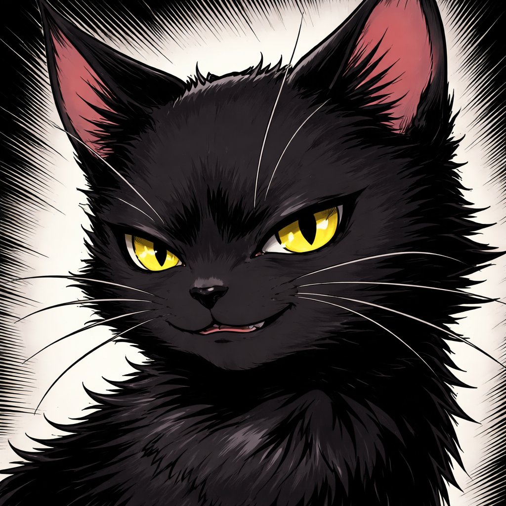 A smug looking black cat with yellow gold curious eyes manga style
