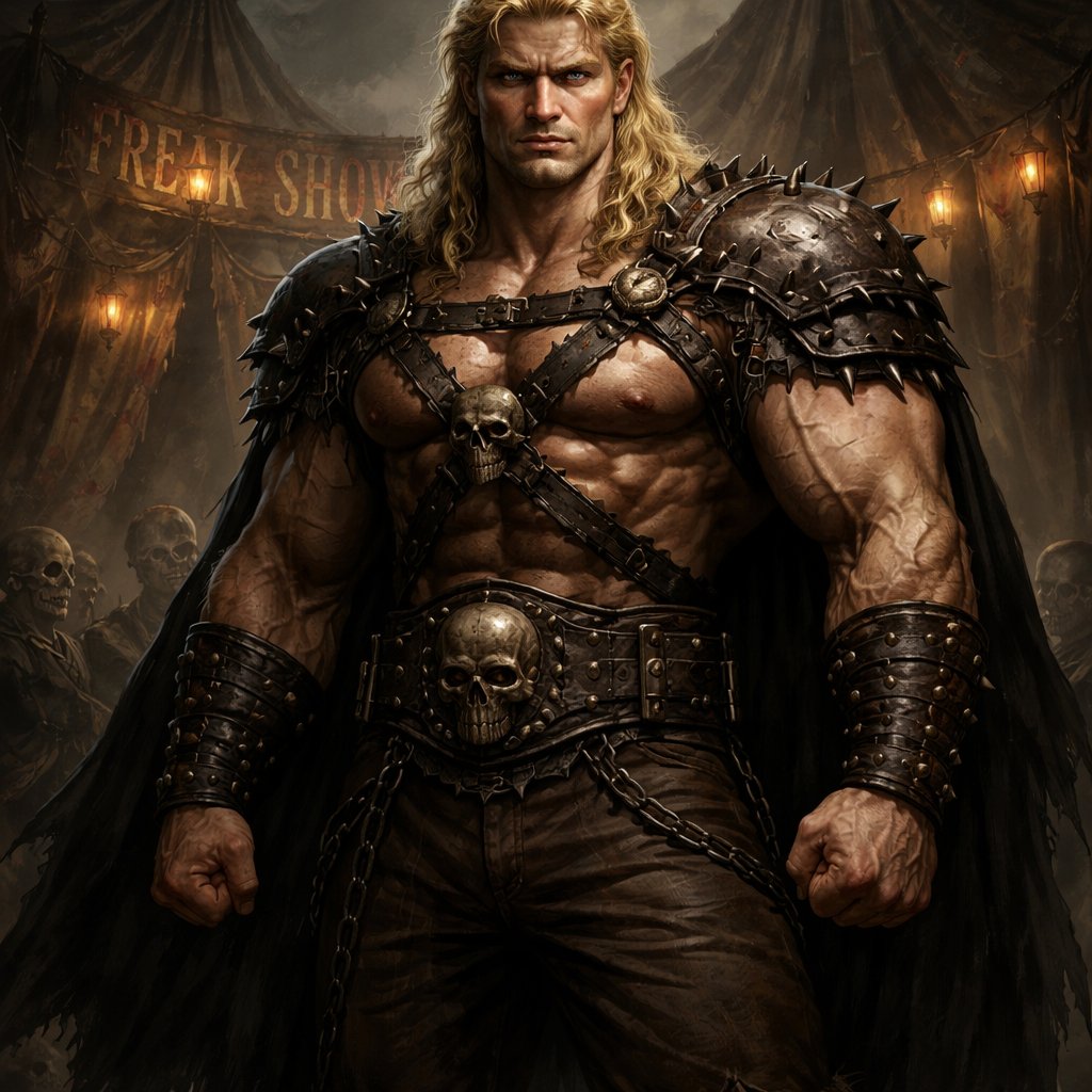 A tall well~proportioned figure/body with “broad-shoulders, thick neck, giving an impression of sheer power”. He also muscular. His haircut is a blonde mullet. His “expression is often serene or determined, with deep-set blue eyes and strong brows, hinting at inner depth". He works at freak show as a strong man. His outfit consistsed of a gladiator outfit but with brown pants.