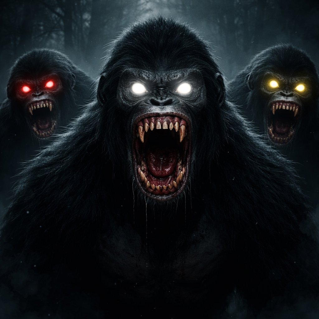 Gorilla face monsters coming out the side of his neck