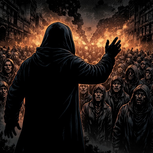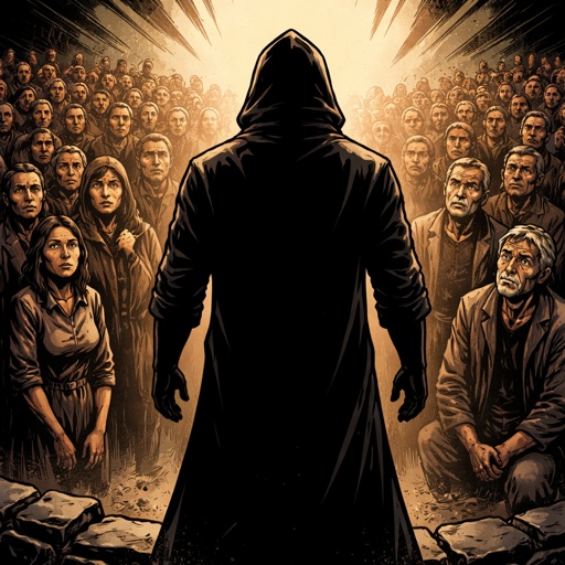 Silhouette of a man in a hood speaking, his hands are at his sidess . before a crowd of impoverished people. These are r...