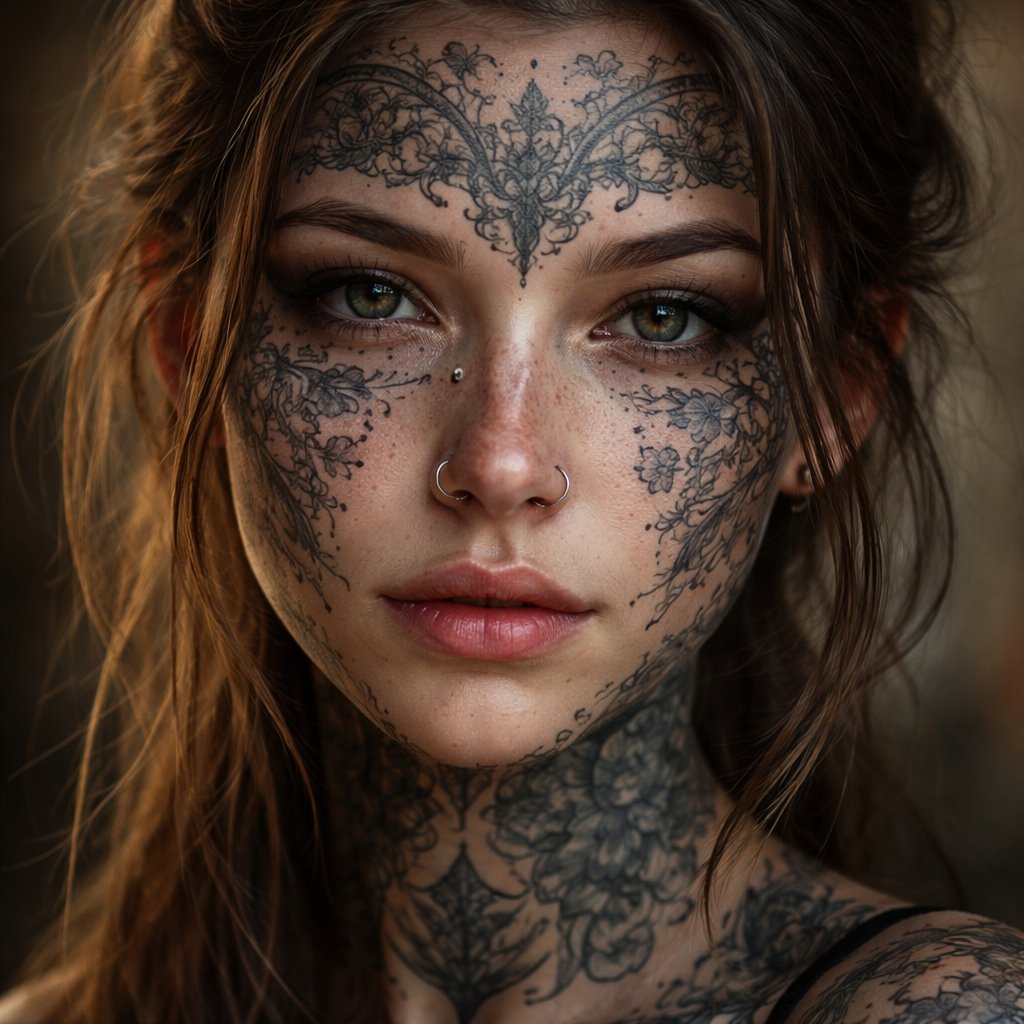 Full picture of a blonde Asian girl with green and red Japanese tattoos all over her face and no piercings