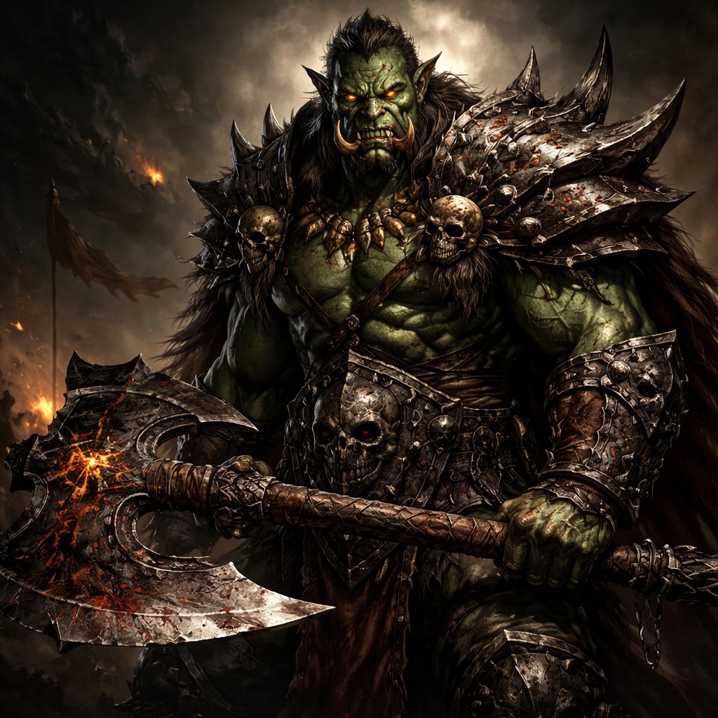 An evil orc barbarian with glowing red eyes and both his stained black with dreadlocks. Wield a greatsword and burning v...