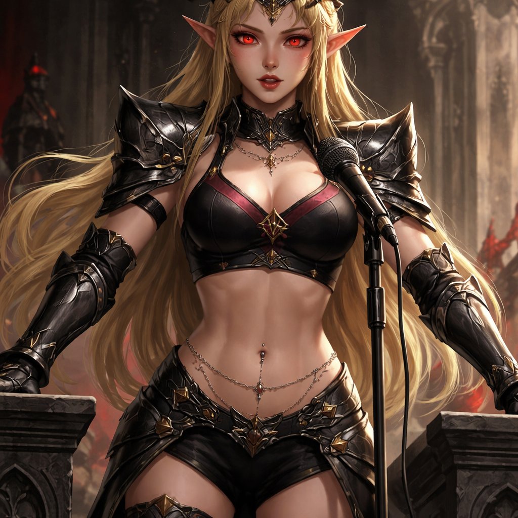 Evil Princess Zelda in a sports bra with a navel piercing chain and black armour on her legs and shoulders giving a speech