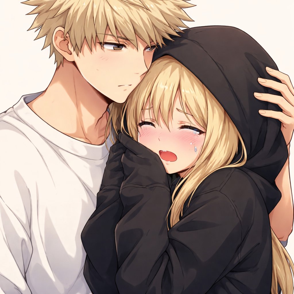 Bakugo hugging a sobbing teenage blonde girl with a black hoodie and the hood on her head