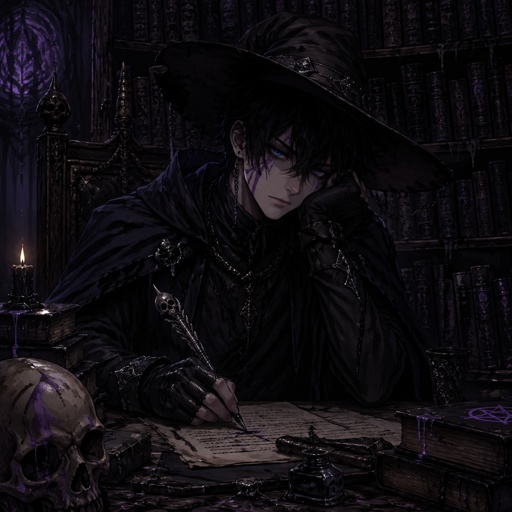 An 18 year old boy who has black hair with purple stripes and blue eyes. He is wearing all black and a black cape. He is...