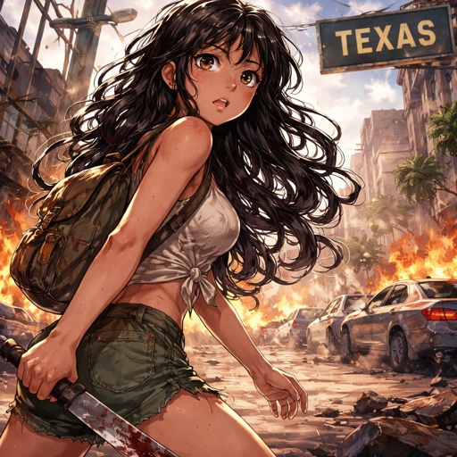 Chaos around all over Texas, with a survivor that looks like Egyptian skin, long black curly hair