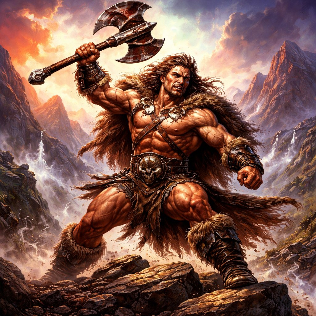 A male firbolg barbarian in his early thirties with baby blue skin. He has wavy dark red hair, dark green eyes, and a cl...