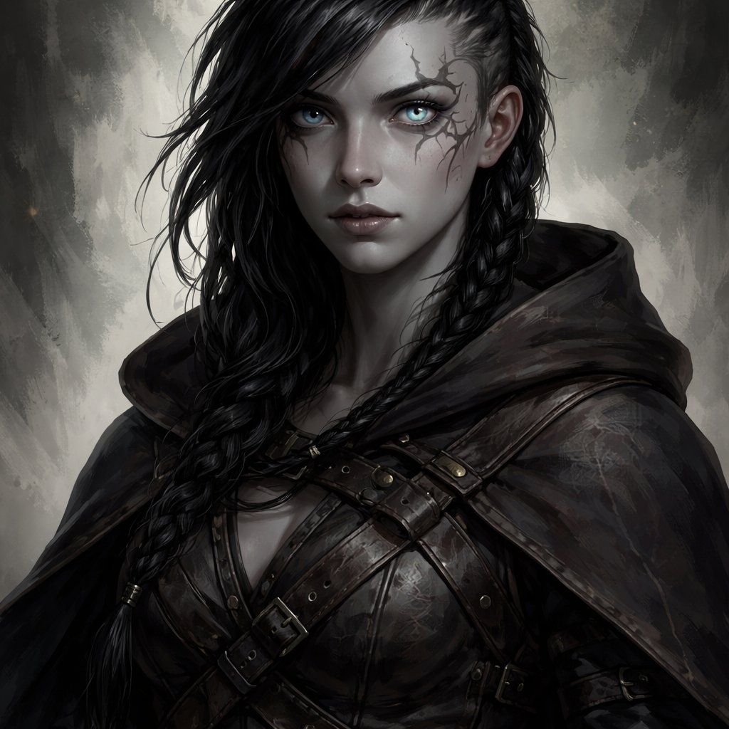 A female goliath from dnd with light grey skin, the right eye is dark blue and the left is almost fogged over (she is blind in the left eye). Her har is black and she is a rouge. She has two tattoos that start at a point under her eyes and goes up to her her and then twists down to her back around the legs to the toes but you only need to generate her portrait (as in mostly her face and a bit of her torso). She is 20 and wears a bit more clothes, she is probably wearing a cloak but the hood is not up and she looks a bit androgynous but not manly