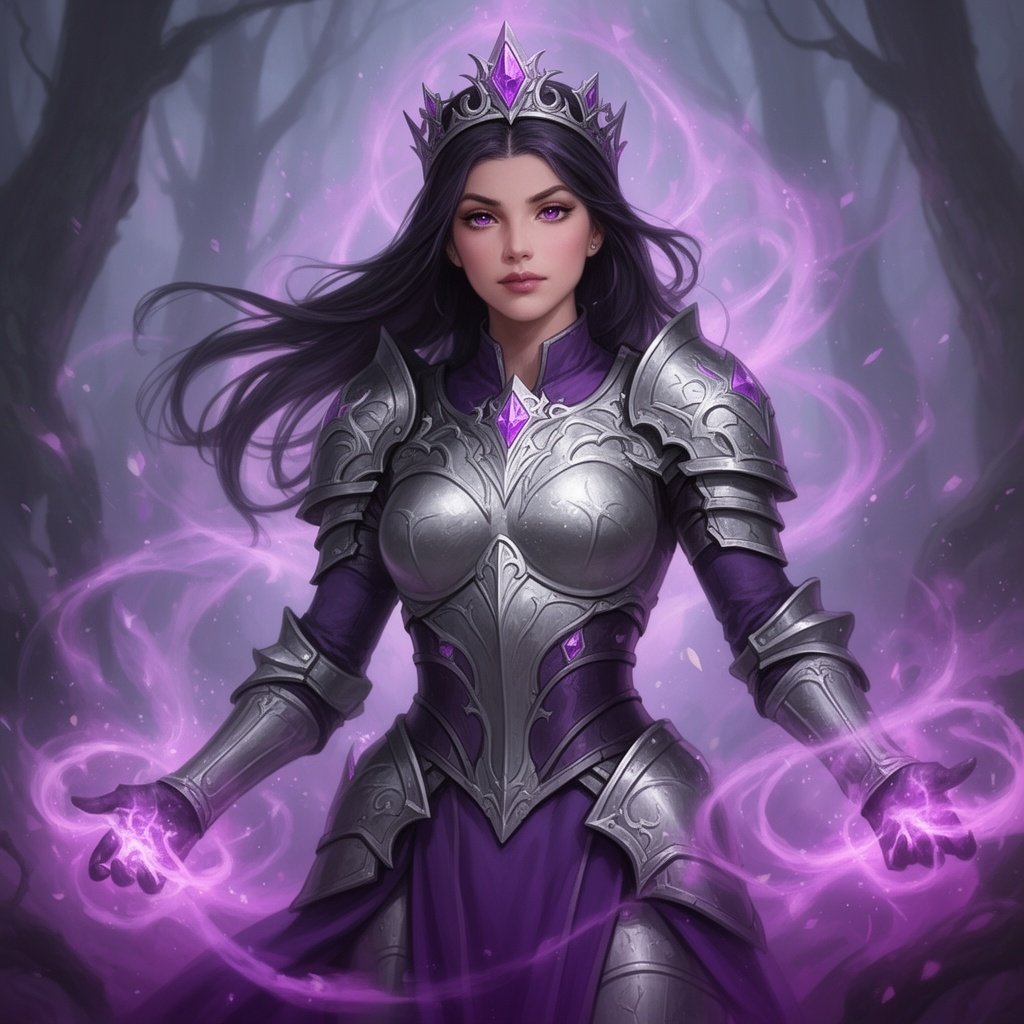 Dark hair woman. Pale and beautiful. Lean and strong. Amethyst eyes. Wearing silver and purple.