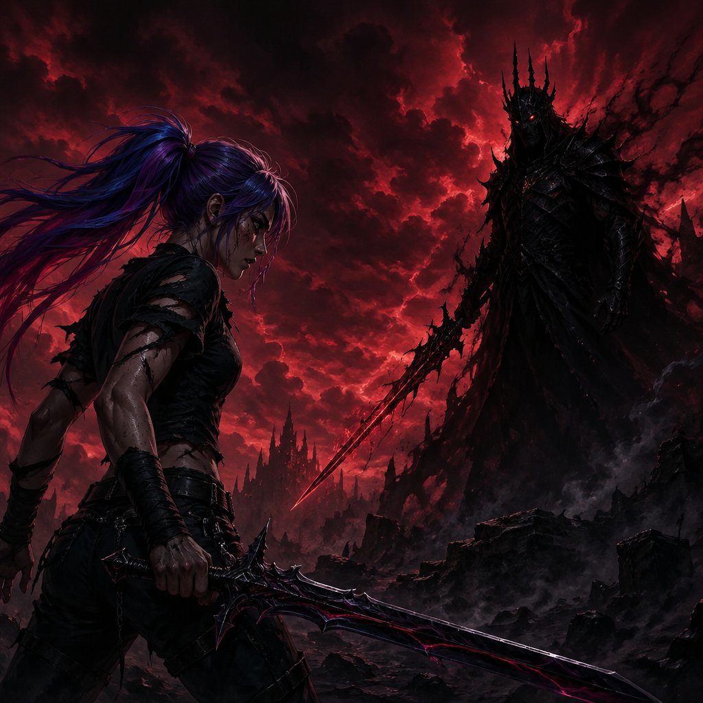 A 17 year old girl who has blue hair with purple and pink stripes and hazel eyes. She is wearing a torn black shirt and black pants. She looks strong and focused and angry. In front of her is a black figure with glowing red eyes. The figure looks strong and evil. They are both holding swords. The sky is a dark red and has black clouds.