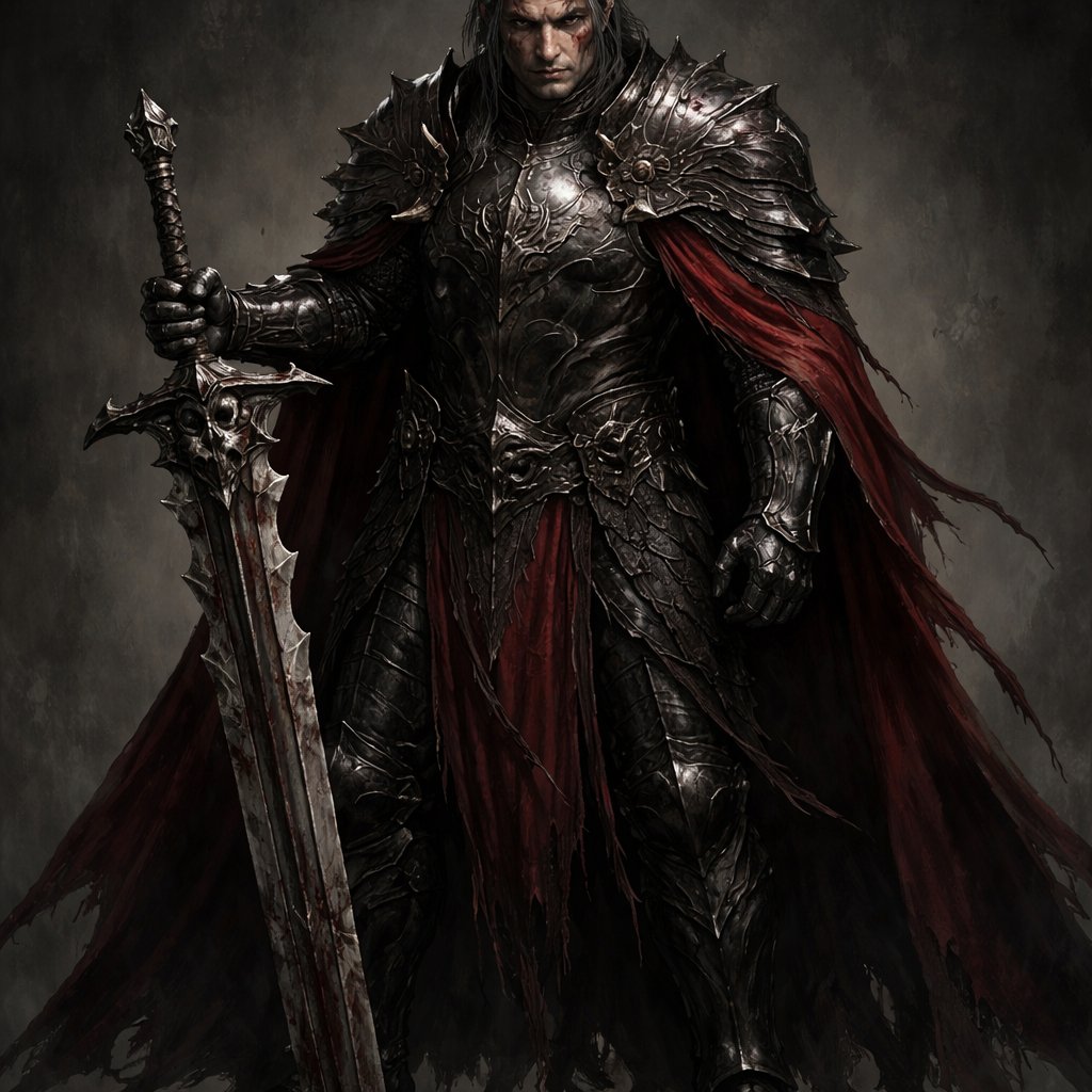 Appearance: • Tall (6’4”), broad and battle-scarred • Black hair streaked with gray, tied back • Deep scar running from brow to jaw across one eye • Wears blackened plate armor etched with stag antlers, and a heavy crimson war-cloak Personality: Cold, calculating, and unyielding. Garrick is not cruel for pleasure—he is cruel because it works. Every decision he makes strengthens House Tanner. Weapon: “Gravehorn” — a massive greatsword with a jagged spine, said to