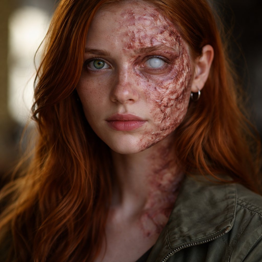 A gorgeous redhead haired girl with crisscross burn scars on her face