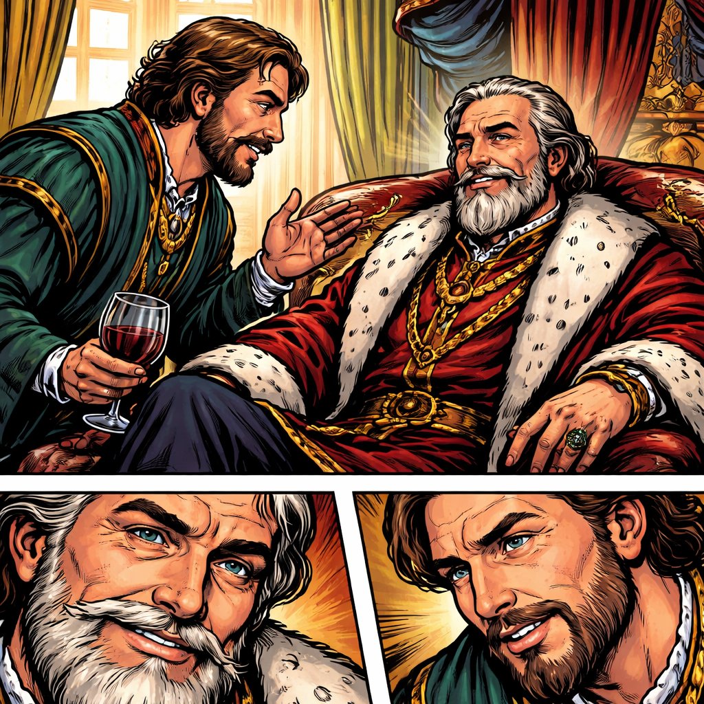 No caricature no speech bubbles very rich man and Renasant robe is sitting in an easy chair. Another man stands beside him, also in Renaissance robe and they are having a discussion panel one next panel close-up of the head of one and close-up of the head of the other.