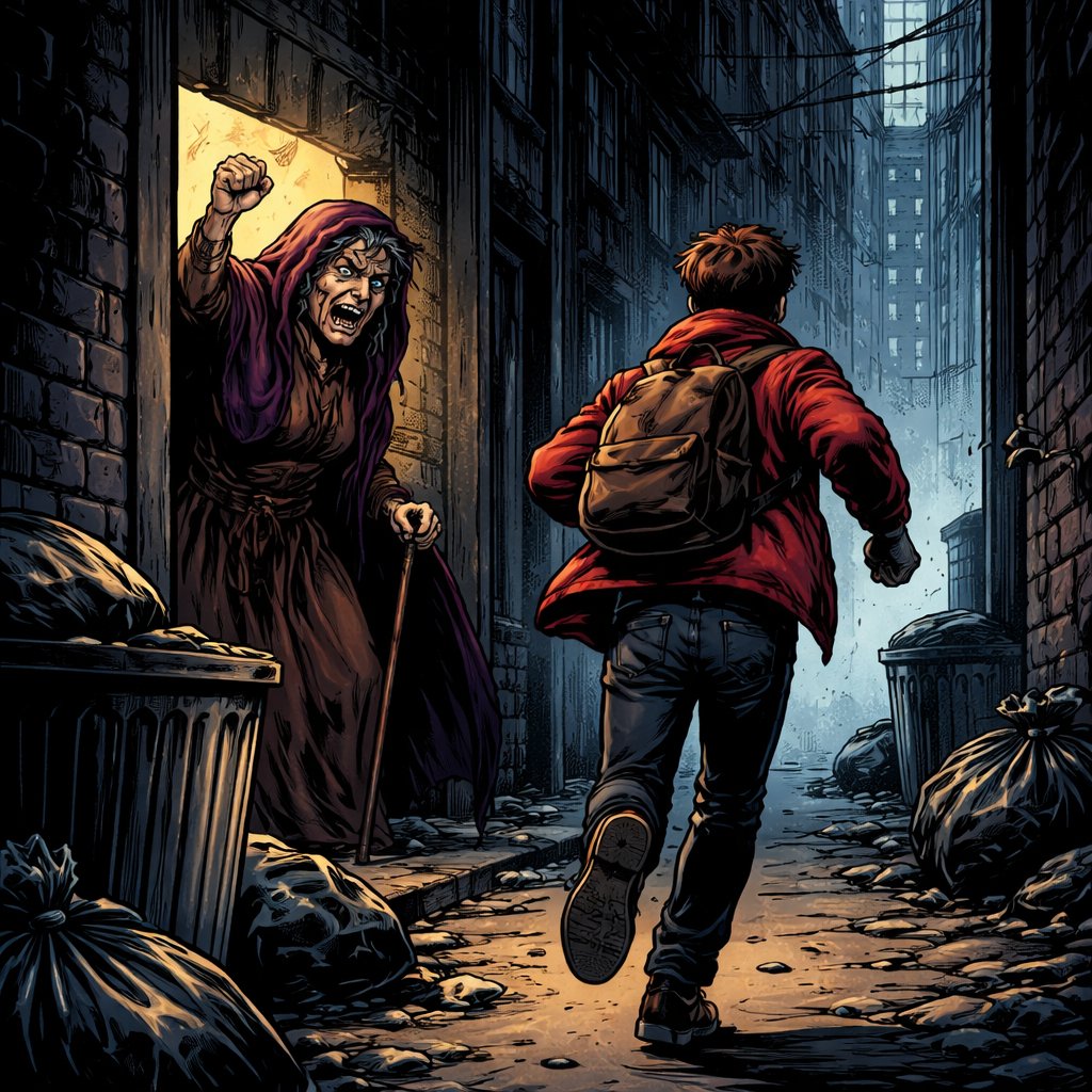 Refined realistic no caricature. No speech bubbles. In the far ground, an ugly old woman is waving his fist at a small figure disappearing out of frame. We see him from the rear. An alley in a dark city.