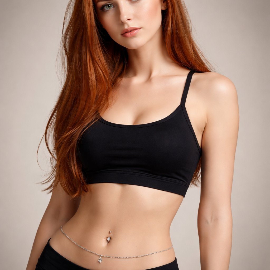 Redhead girl in a sports bra with a navel piercing chain that goes around her waist