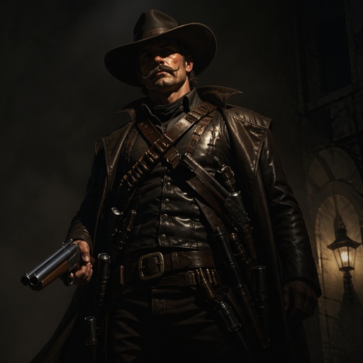 Human highwayman with tan white skin. Has short brown hair, thick handlebar moustache. He has leather armour with multip...