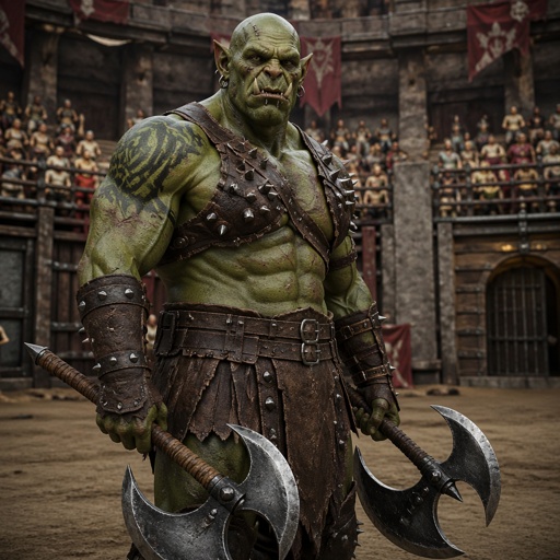 Male hobgoblin gladiator. Has spike leather armour as well as arm bracers. His skin is bright green covered in scars, ta...