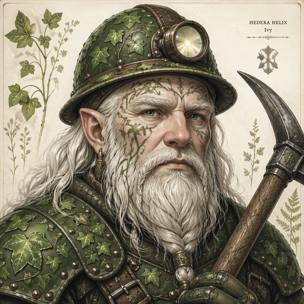 Deep gnome male, pale skin with multiple face tattoos. Has long white hair and a goat T. Bright green studded leather armour with a miner’s helmet and holding a military pick