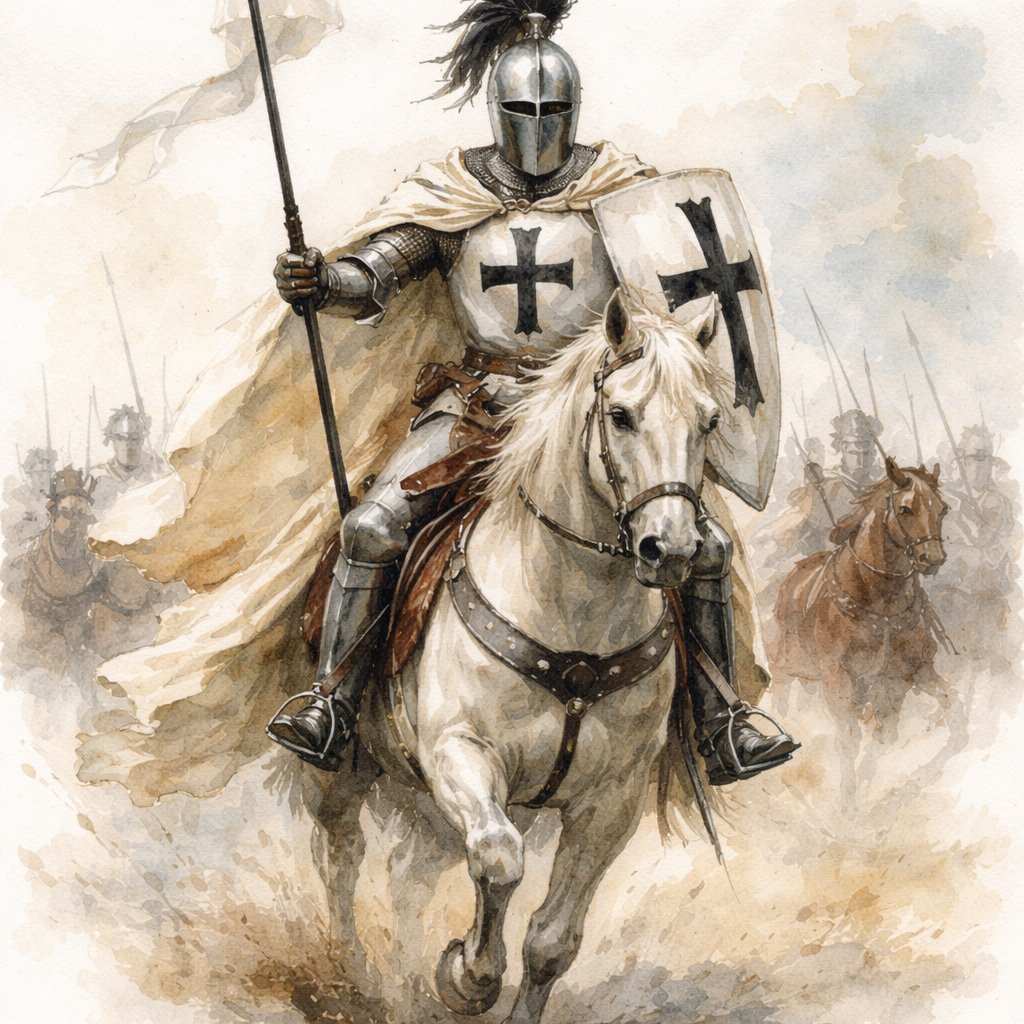 A mounted commander in charge of cavalry with white armour, a black cross on the armour and he is wielding a spear and s...