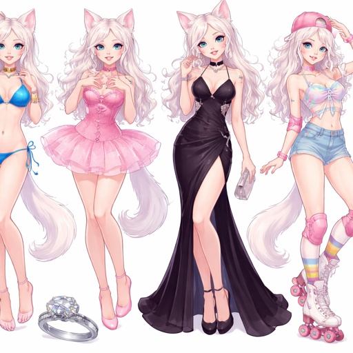 A villain girl wearing a baddie outfit. Her hair is black with tints of red. She is petting a tuxedo cat on a black Roll...