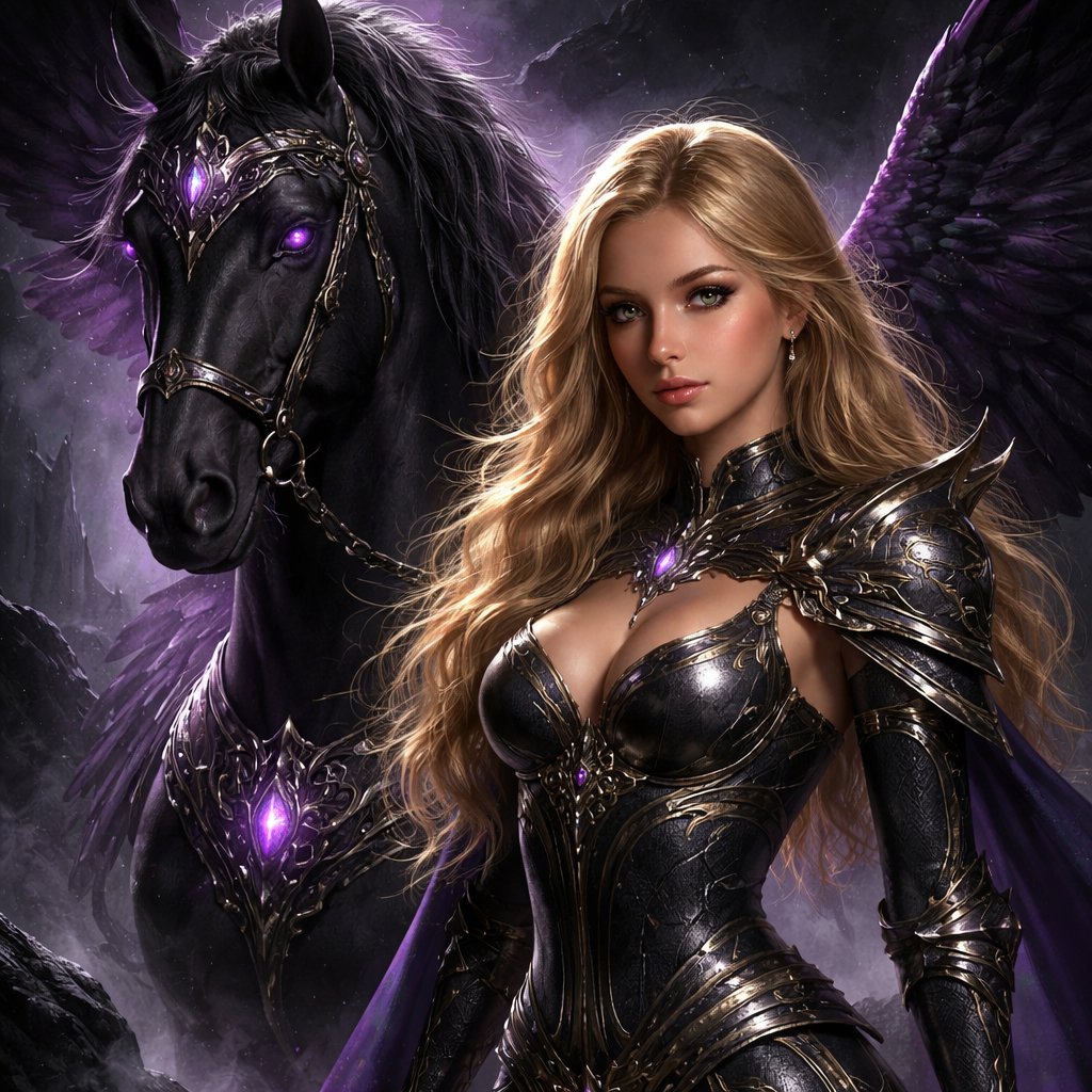 Tan and Blonde 17 year old girl with brown eyes. Long dark eyelashes and irises with gold flecks highlighted by gold flecked eyeliner. Black background with dark fog and rocks. She’s riding a regal horse. She has dramatic black wings with a purplish hue. She’s wearing a skin tight decorated armor