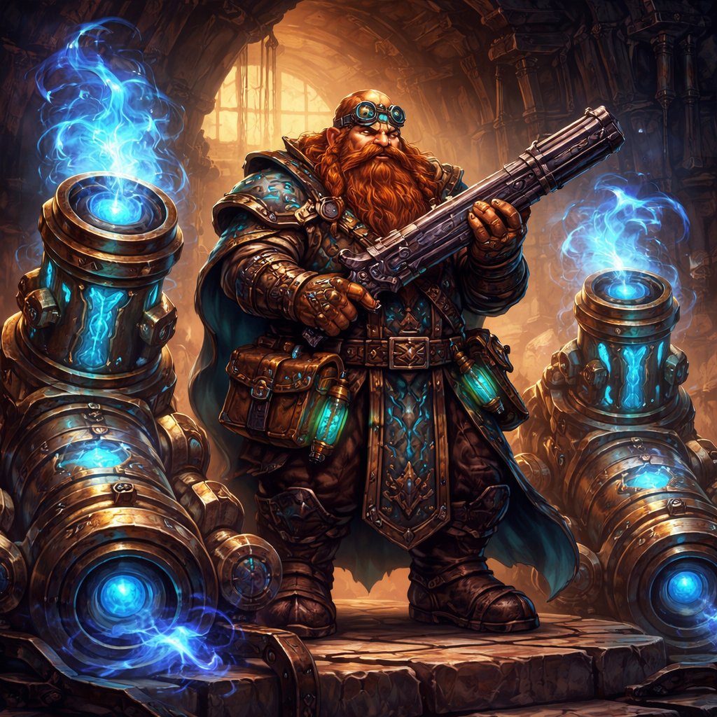 Dwarf artificer with magical canons next to him while he holds a musket