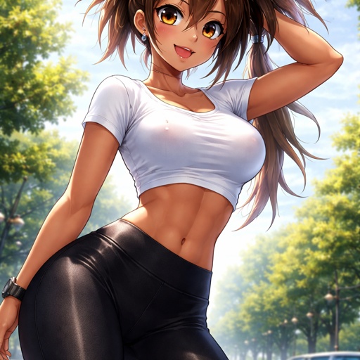 A tanned girl in leggings and a buldging cropped shirt
